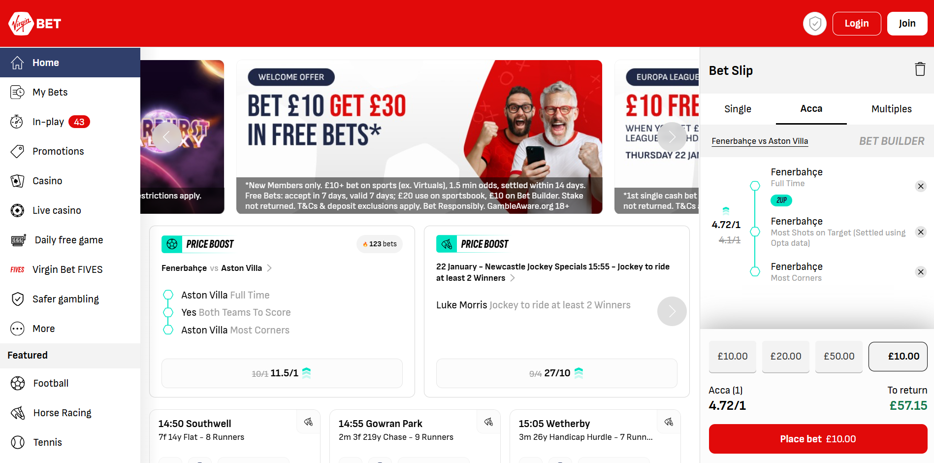Virgin Bet presents a strong selection of sports markets and odds, with notably impressive football and horse racing coverage that resonates well with UK bettors, featuring competitive pricing both pre-match and in-play. The platform includes live betting supported by real-time statistics and live streaming on chosen races and fixtures, while tools such as Cash Out and Bet Builder allow punters to customise wagers and control exposure mid-event when using betting sites not on GamStop.
